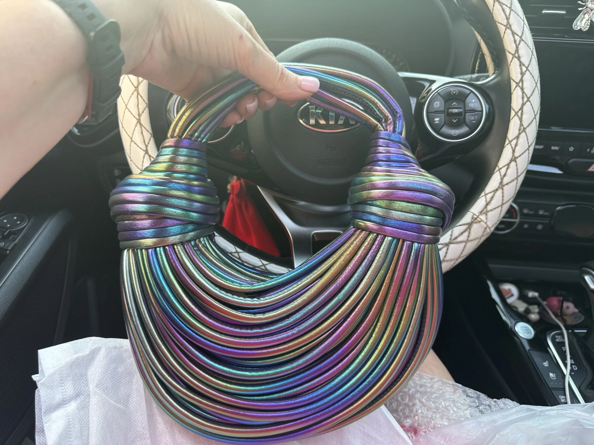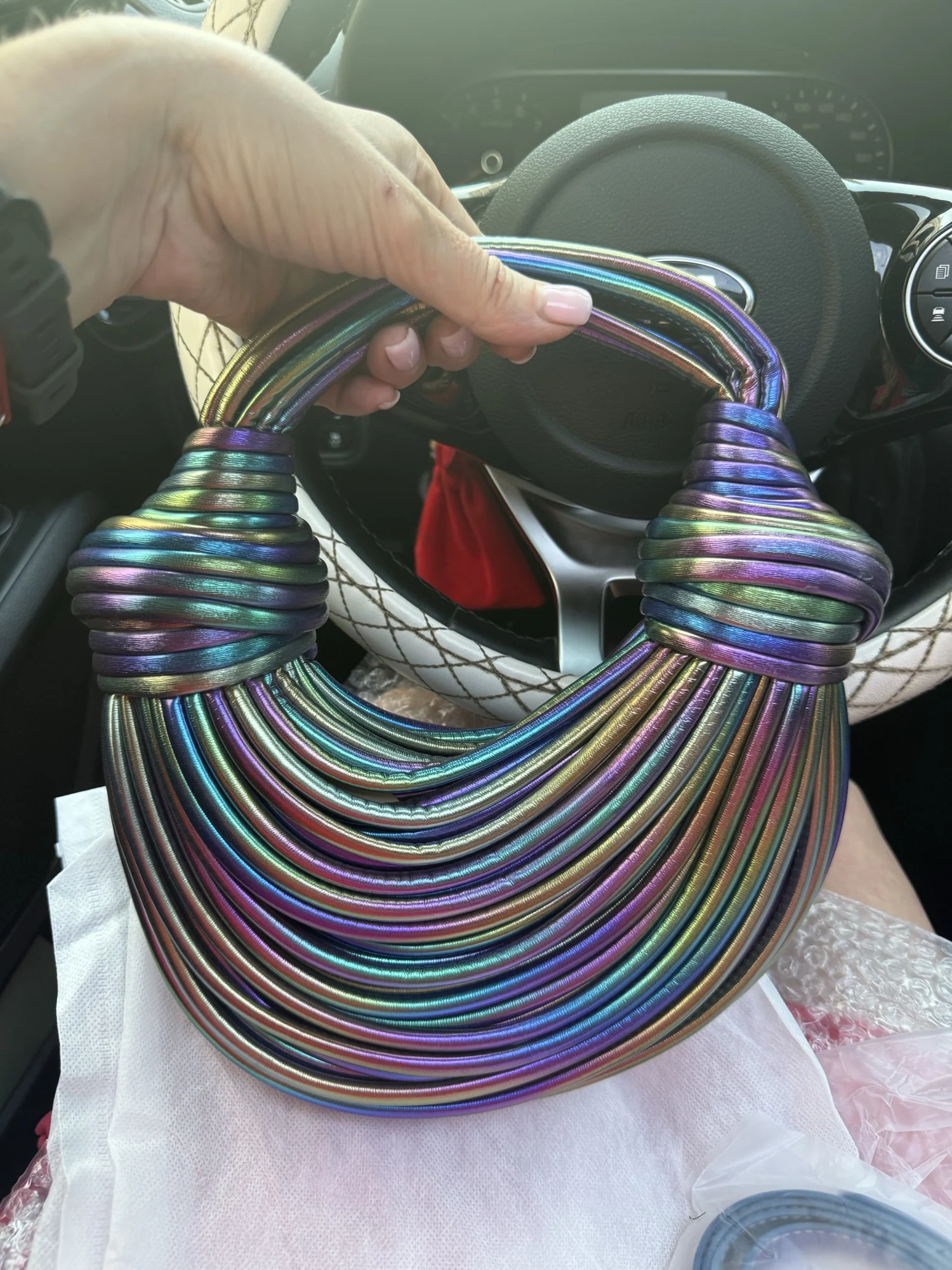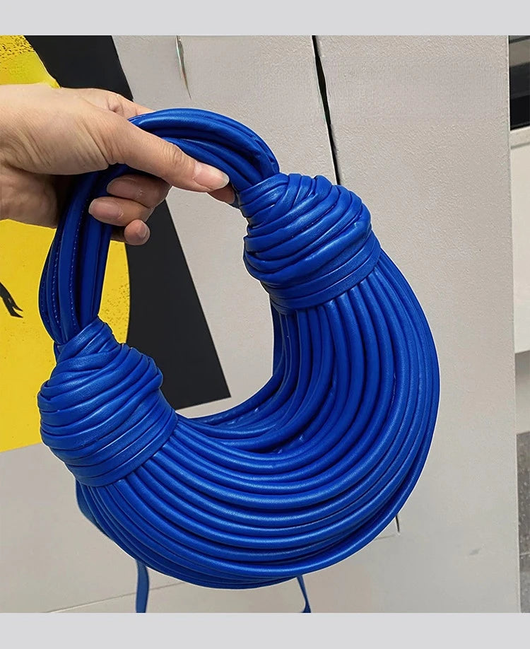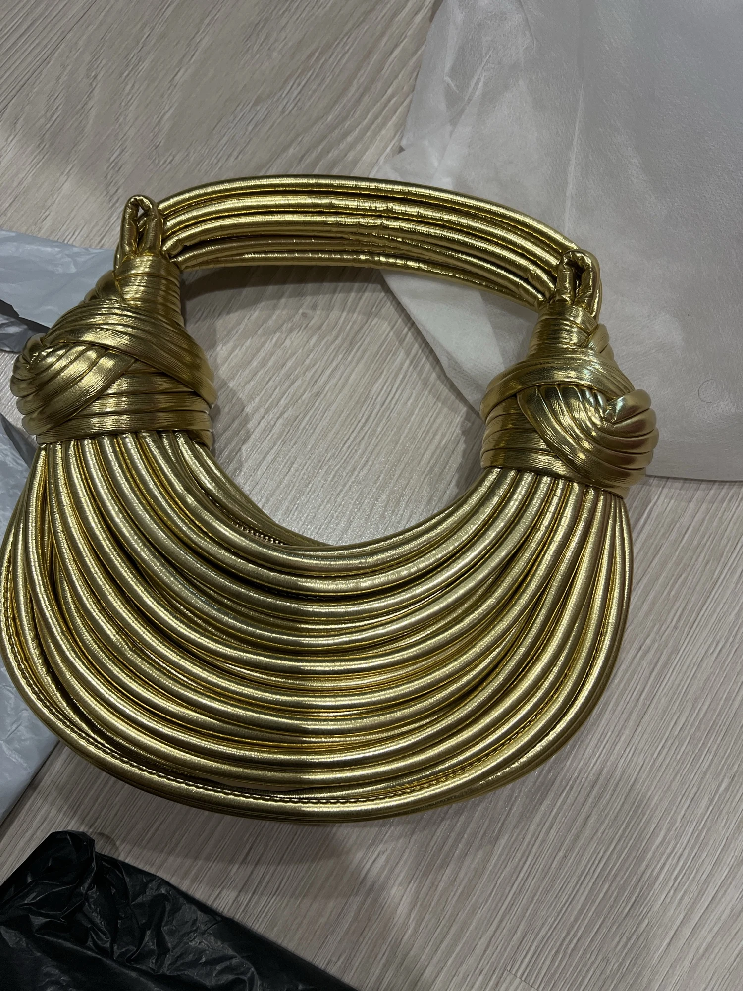 Turn heads with this luxury handwoven knot handle handbag, crafted with a bold rope-inspired design that combines art and elegance. Its unique curved silhouette and metallic gold finish make it the perfect statement accessory for both casual outfits and glamorous evenings.