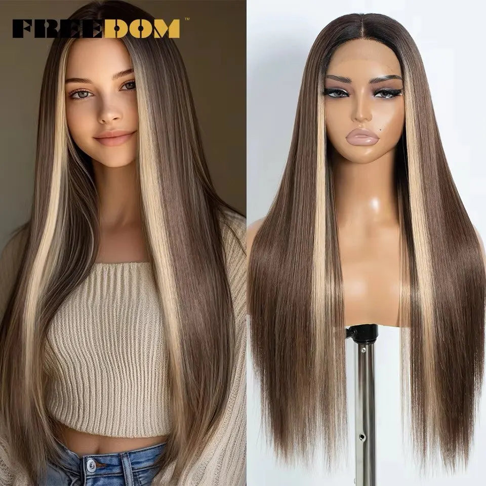 Freedom synthetic lace front wigs for women ombre brown highlight long straight lace wig heat resistant cosplay wigs